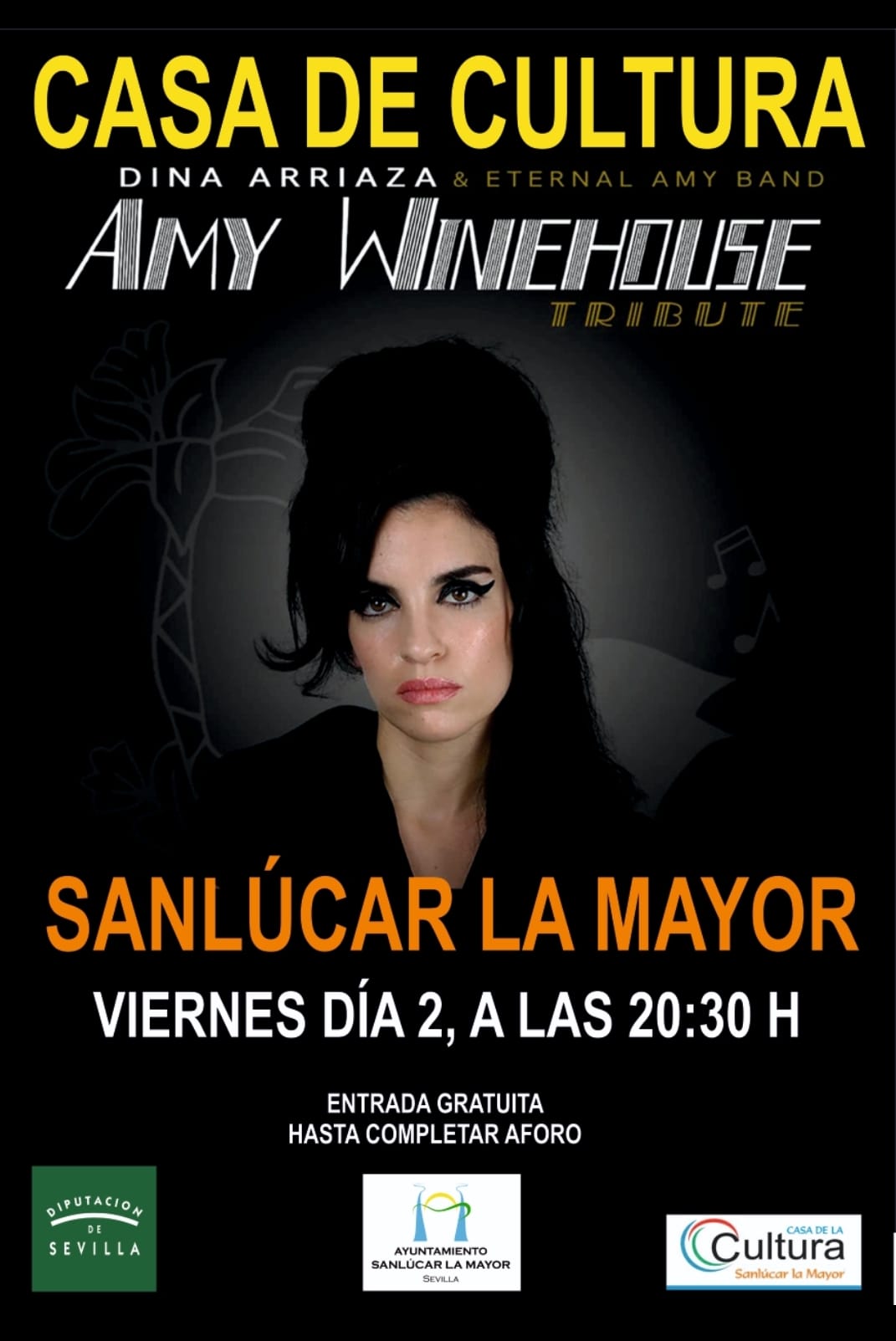 El próximo viernes día 2, a las 20:30 H, organizado por el área de Cultura, Sanlúcar se viste de gala con el magnífico concierto tributo a "AMY WINEHOUSE", acompañada por la magnífica banda, Eternal Amy Band, compuesta de grandes músicos. Entrada gratuita hasta completar el aforo.