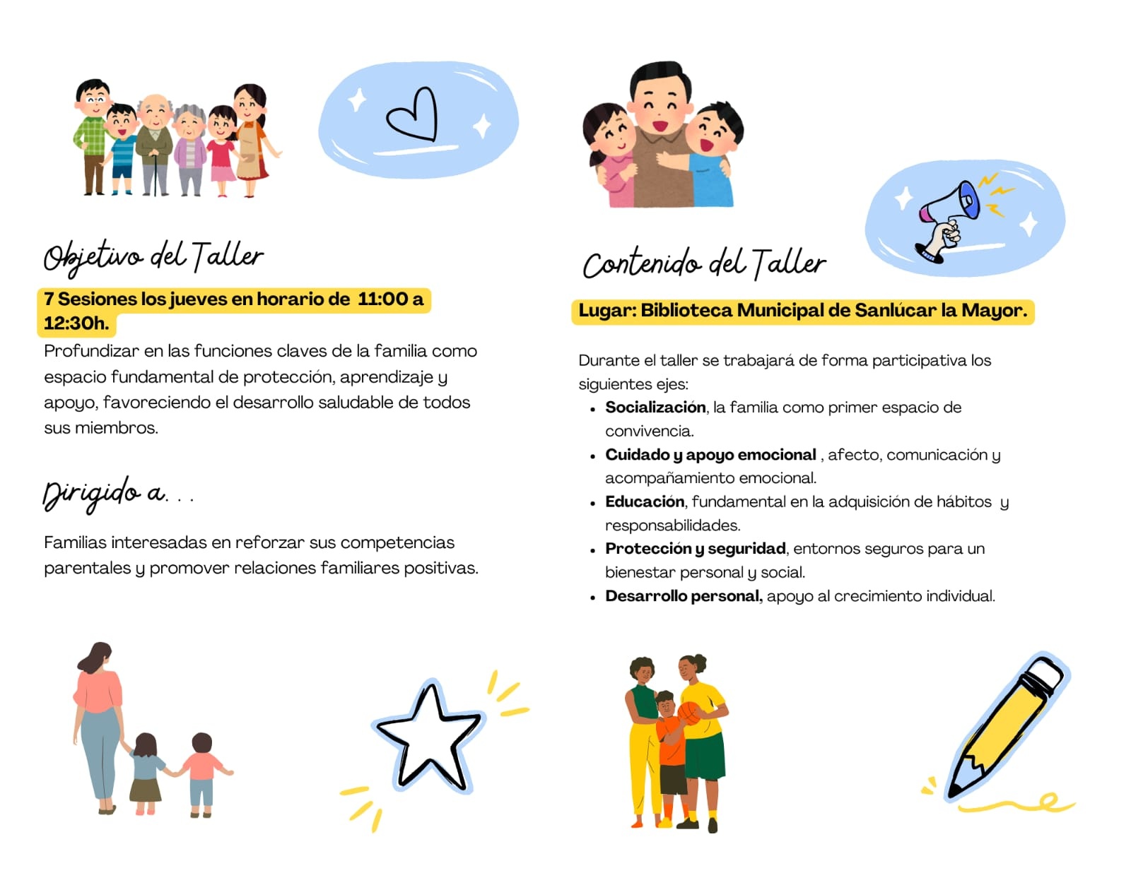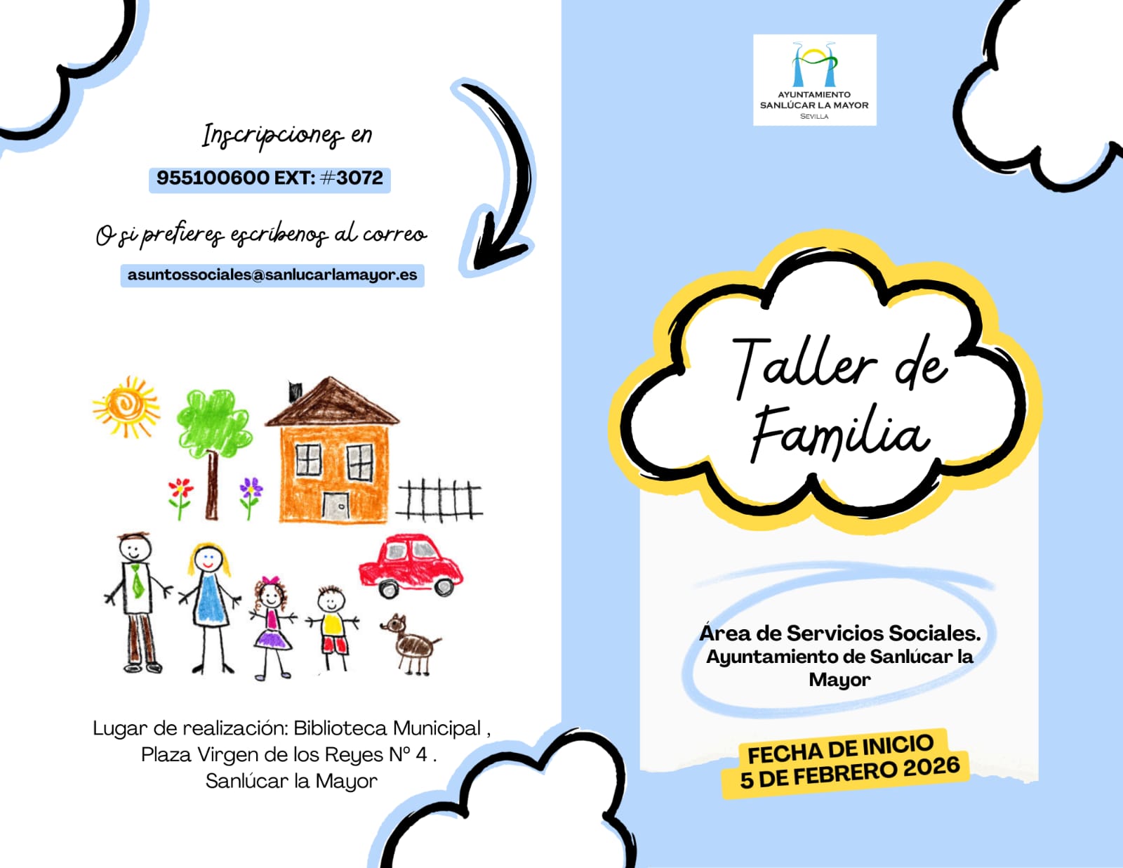 Desde el Área de Servicios Sociales del Ayuntamiento de Sanlúcar la Mayor, a cargo de Juan Salado, informamos del ‘Taller de Familia’. Una actividad que dará comienzo el próximo 5 de febrero de 2026. Esta actividad está dirigida a todas aquellas familias interesadas en construir y reforzar sus vínculos intrafamiliares de manera consciente, adaptativa y positiva.