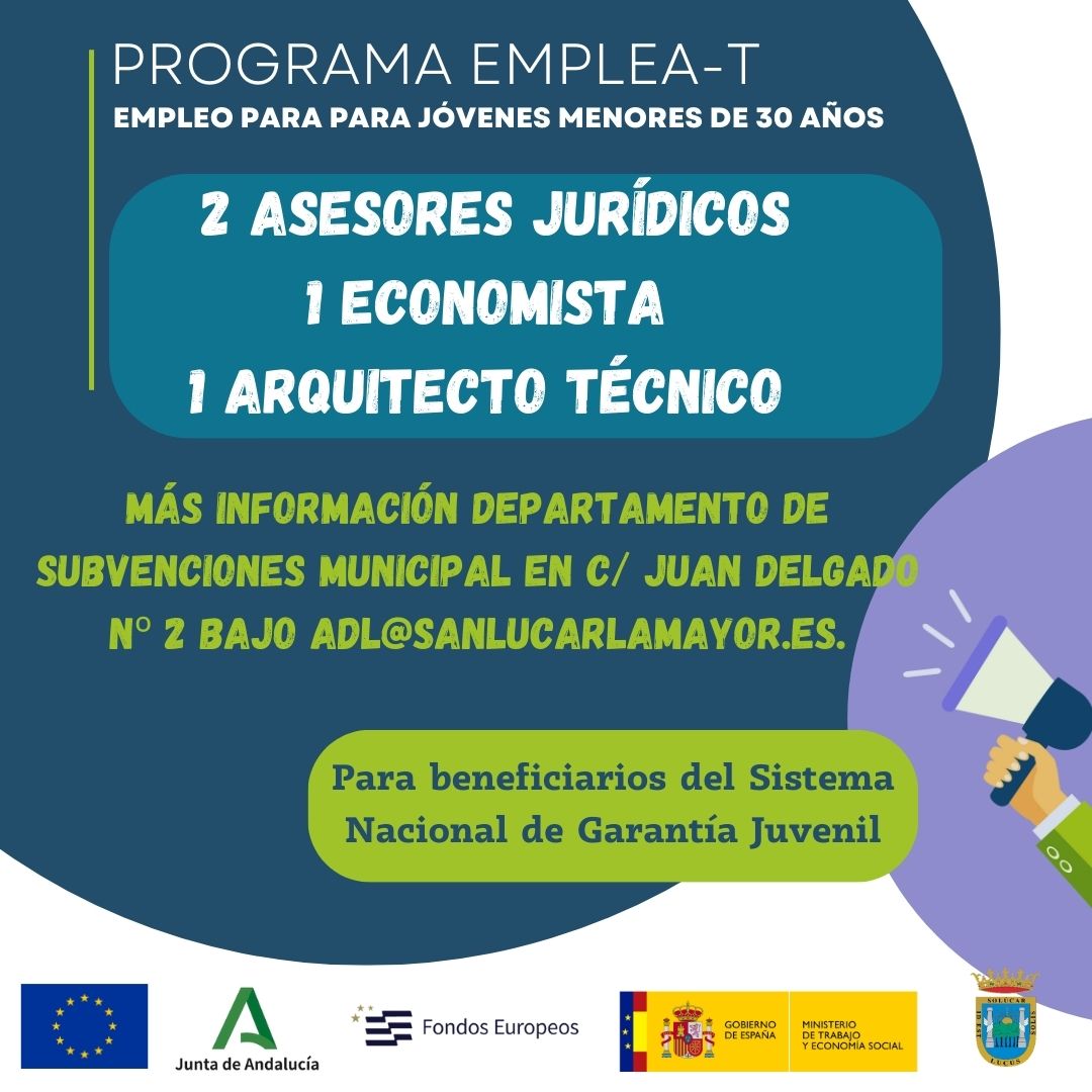 El Ayuntamiento de Sanlúcar la Mayor informa que ya está abierta la convocatoria del Programa EMPLEA-T Línea 7, destinada a fomentar el empleo de jóvenes inscritos en el Sistema Nacional de Garantía Juvenil.