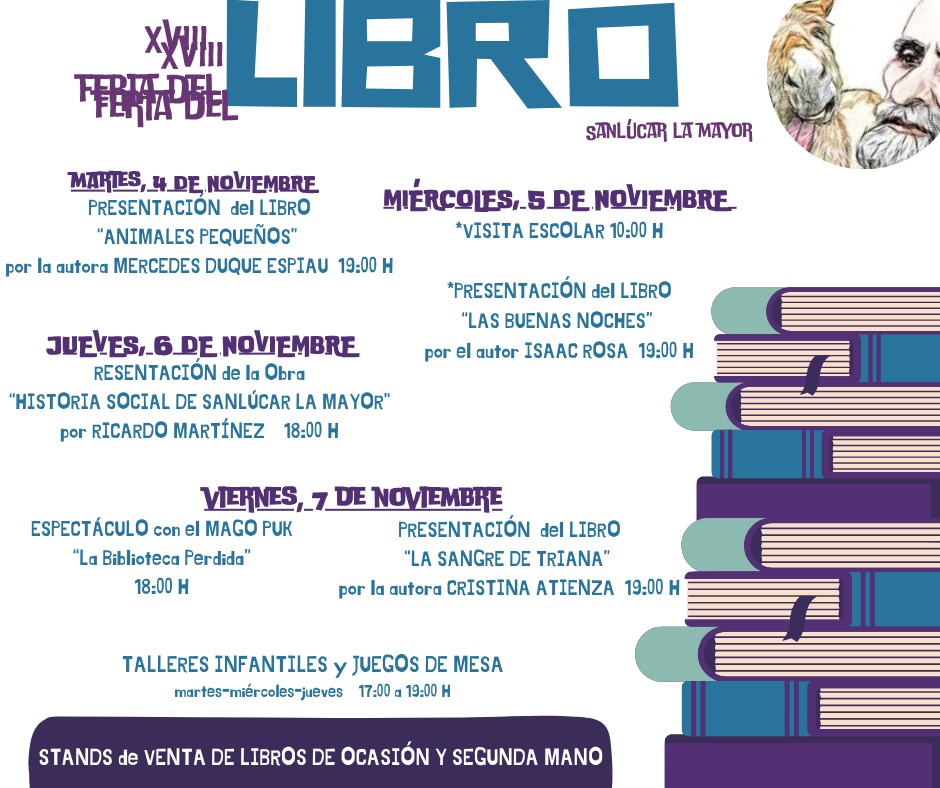 Sanlúcar la Mayor se prepara para vivir una nueva cita con la literatura. Del martes 4 al sábado 8 de noviembre se celebrará la decimoctava edición de la Feria del Libro, una cita ya consolidada en el calendario cultural del municipio y que este año se presenta bajo el lema “Mueve la magia de los libros, ven, lee y descubre”.