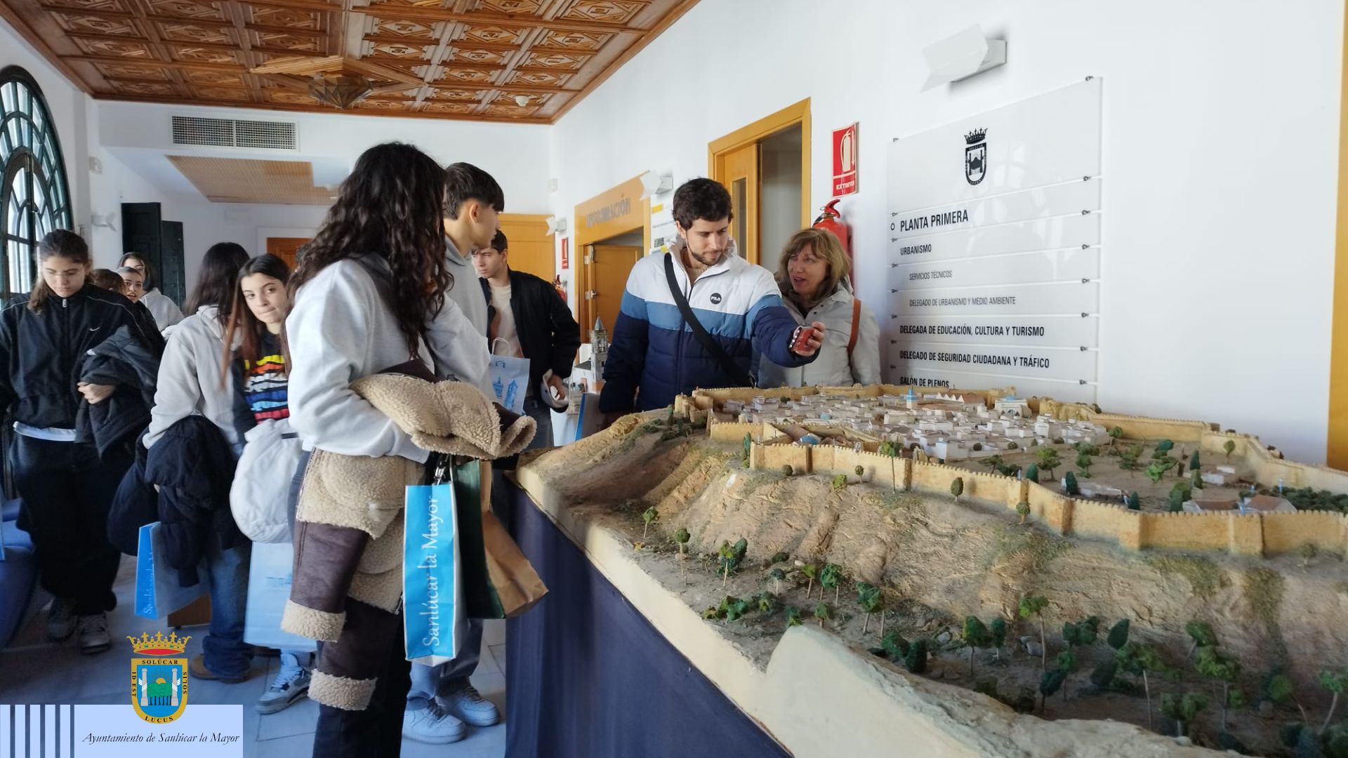 En la Casa Consistorial, el grupo ha sido recibido por el Teniente de Alcalde Delegado de Asuntos Sociales, Juan Salado, y el Teniente Alcalde Delegado de Turismo, Eduardo Jacob Macías. Desde esta área municipal, se ha organizado una visita guiada por la localidad, en la que se ha dado a conocer parte de la historia y los principales recursos patrimoniales con los que cuenta Sanlúcar la Mayor. Como gesto de bienvenida, el Ayuntamiento ha obsequiado al alumnado italiano con un recuerdo conmemorativo y una bolsa con productos típicos locales, gracias a la cortesía de la empresa sanluqueña "Frutos Secos Reyes".