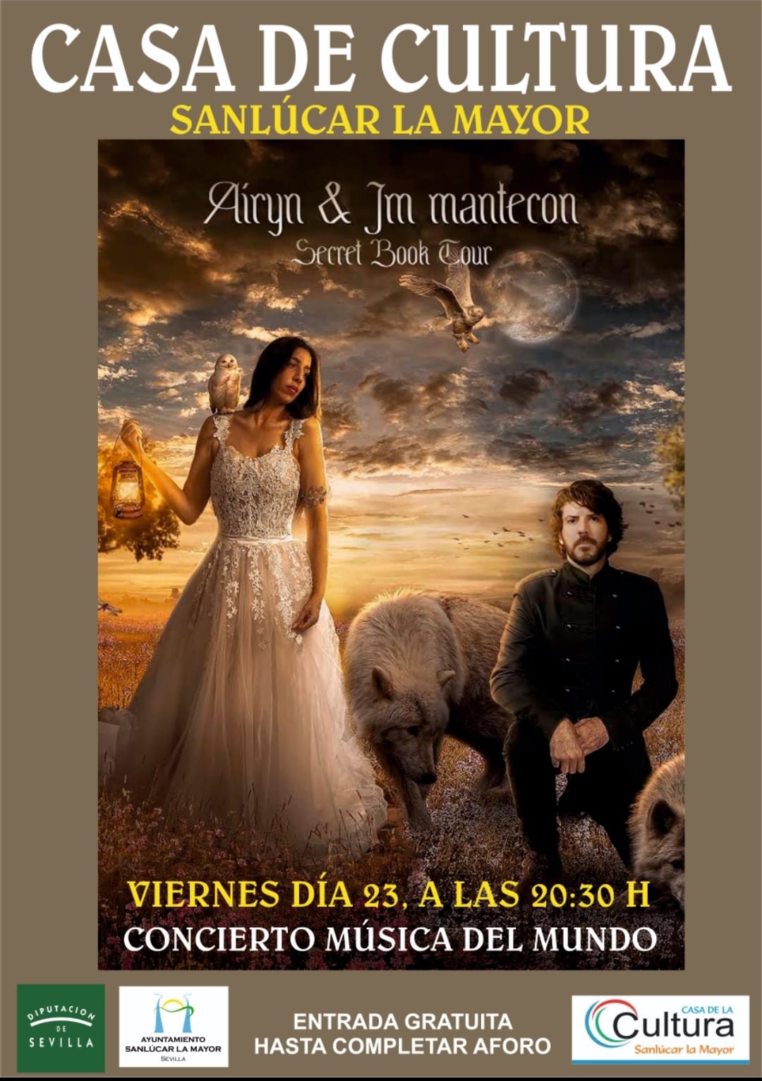 Continuando con la amplia y variada programación cultural en el Teatro de la Casa de Cultura, esta vez, y dentro del mes de Andalucía, este viernes día 23, a las 20:30 H, tendremos el espectacular concierto de la famosa cantante, "AIRYN & JM MANTECON", con el sensacional espectáculo "SECRET BOOK", que se encuentra de gira por los grandes escenarios de nuestro país. ENTRADA GRATUITA HASTA COMPLETAR AFORO.