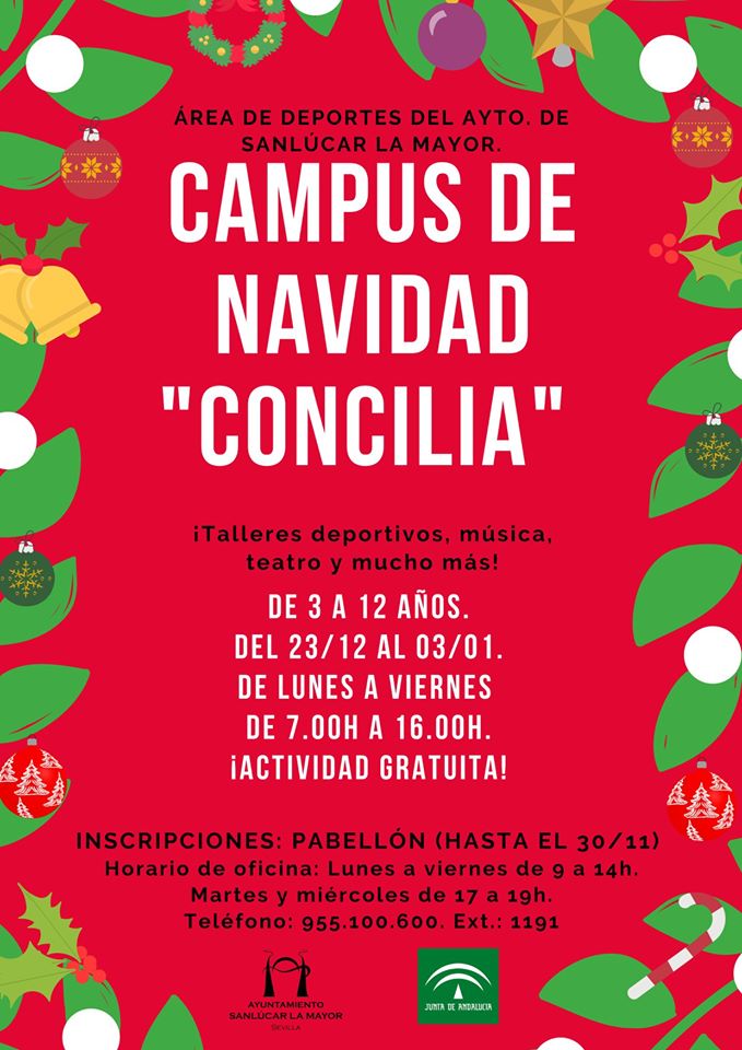 Desde el 23 de diciembre de 2019 hasta el 3 de enero de 2020 el Área de Deportes del Ayuntamiento de Sanlúcar la Mayor, en materia de conciliación de la vida familiar y laboral, pondrá el marcha el Campus de Navidad -Concilia-