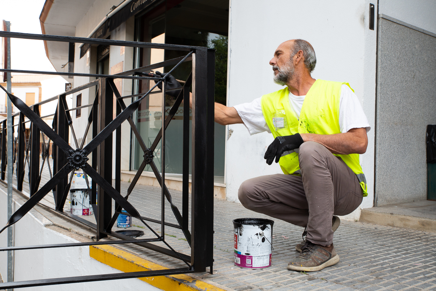 Los pintores contratados con cargo a la Iniciativa de Cooperación Local del Ayuntamiento de Sanlúcar la Mayor se encuentran, desde la semana pasada, realizando labores de mantenimiento y pintado de las rejas de los espacios públicos de la localidad.