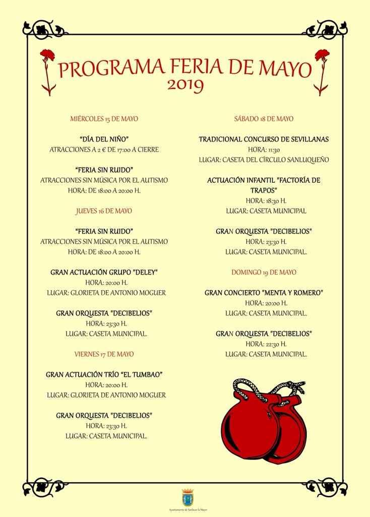 Desde el Área de Fiestas Mayores del Ayuntamiento de Sanlúcar la Mayor nos invitan a participar en el programa de actuaciones que se ha preparado para la Feria de Mayo. Los grupos “Menta y Romero”, “Deley”, el espectáculo infantil a cargo de “Factoría de Trapos”, la animación del grupo “Cosa de 3” y la orquesta “Decibelios” entre otros, serán los encargados de animar la tradicional fiesta. Tendrán lugar en la Caseta Municipal y la Glorieta Antonio Moguer.