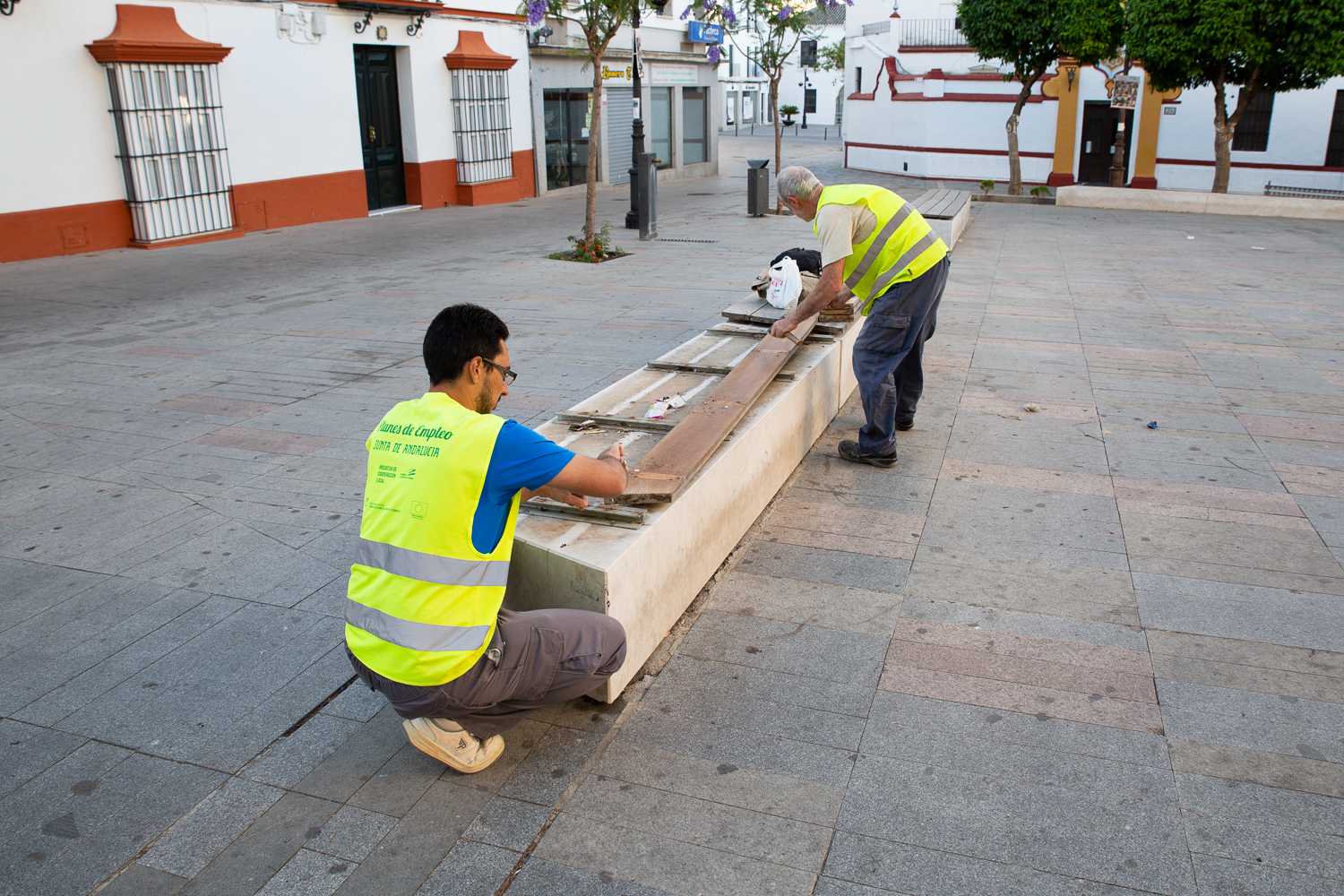 Restauración del mobiliario urbano por los operarios de los Planes de Empleo