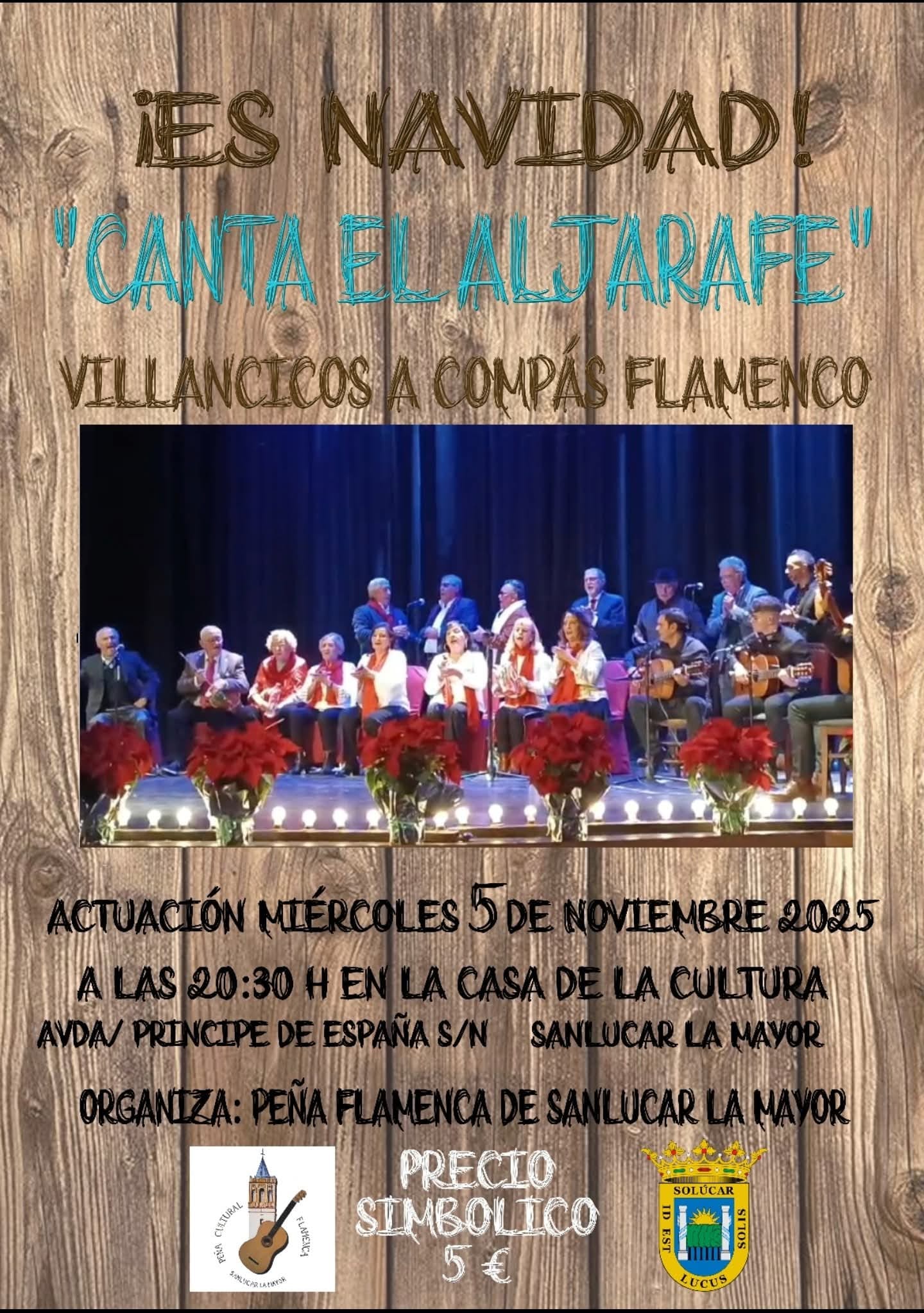 - MIÉRCOLES DÍA 5, Coro de Villancicos Flamencos, "CANTA EL ALJARAFE". Entradas: 5 €. Organiza peña Flamenca de Sanlúcar la Mayor.