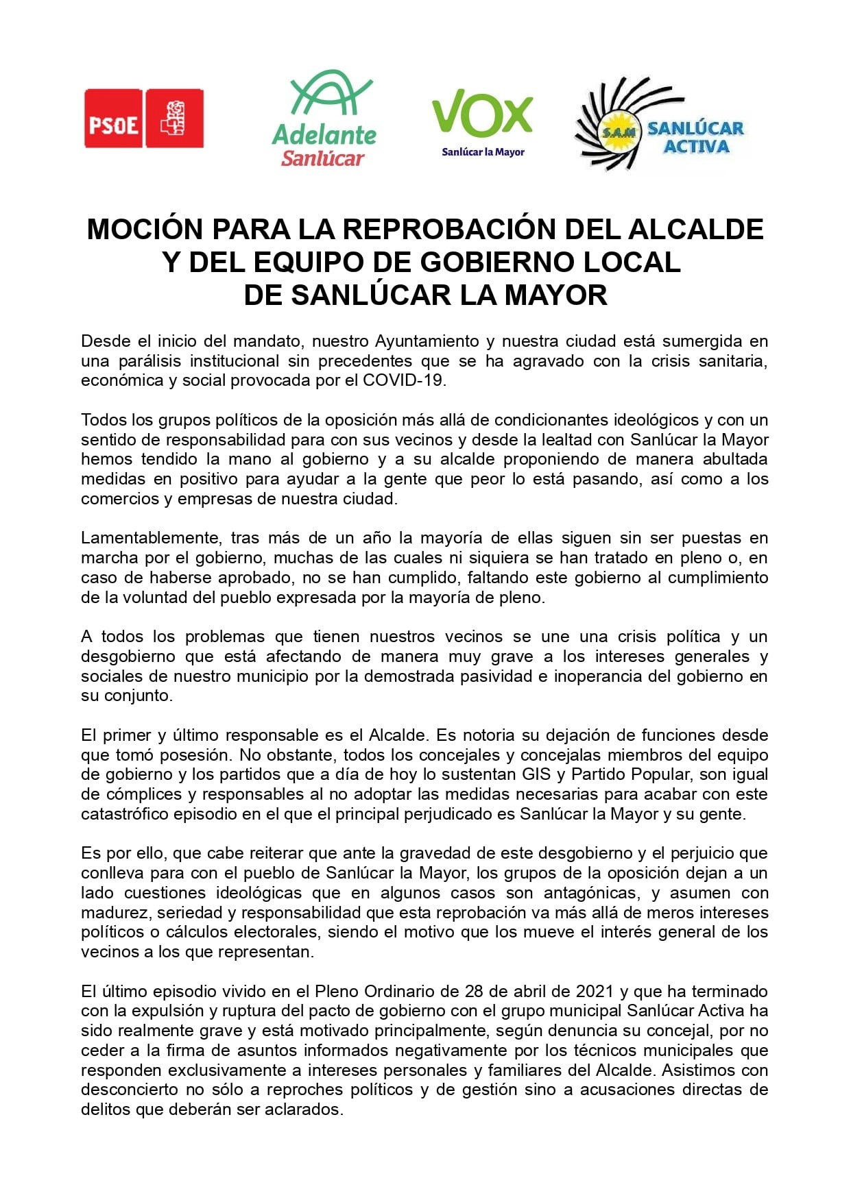 MOCIÓN PARA LA REPROBACIÓN DEL ALCALDE Y DEL EQUIPO DE GOBIERNO LOCAL DE SANLÚCAR LA MAYOR